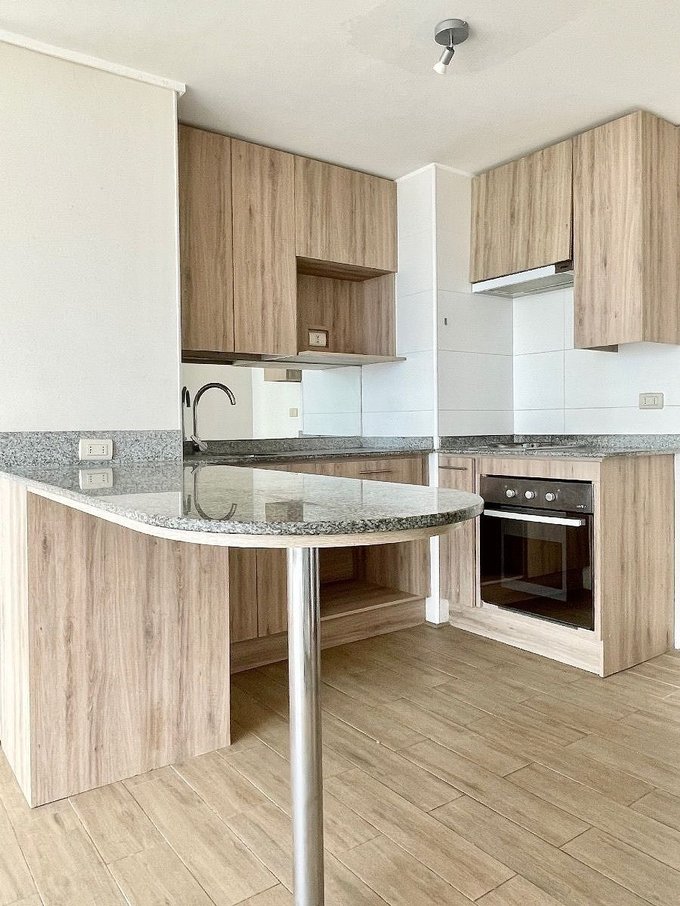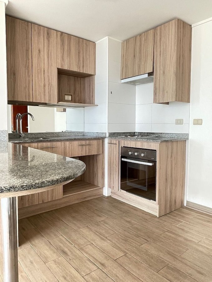 Cocina integrada, equipada con horno y encimera eléctricos, espacio para lavavajilla, campana, mesada de granito.