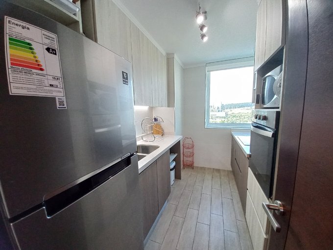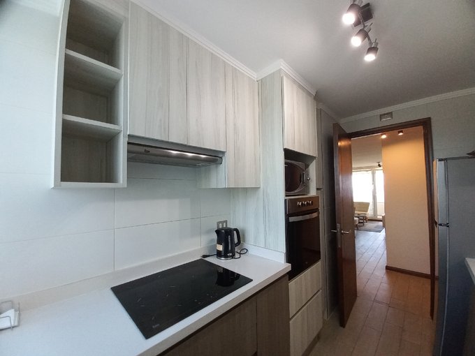El departamento cuenta con 3 dormitorios con clóset, 2 baños (uno en suite), ambos con ventilación natural, cocina independiente totalmente equipada (encimera eléctrica, horno empotrado, campana eléctrica, refrigerador y microondas), living y comedor, amplia terraza con vista al mar, cerrada con sistema de cristales plegables de vista libre, y 1 estacionamiento subterráneo.