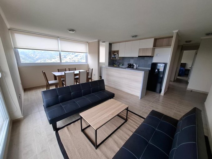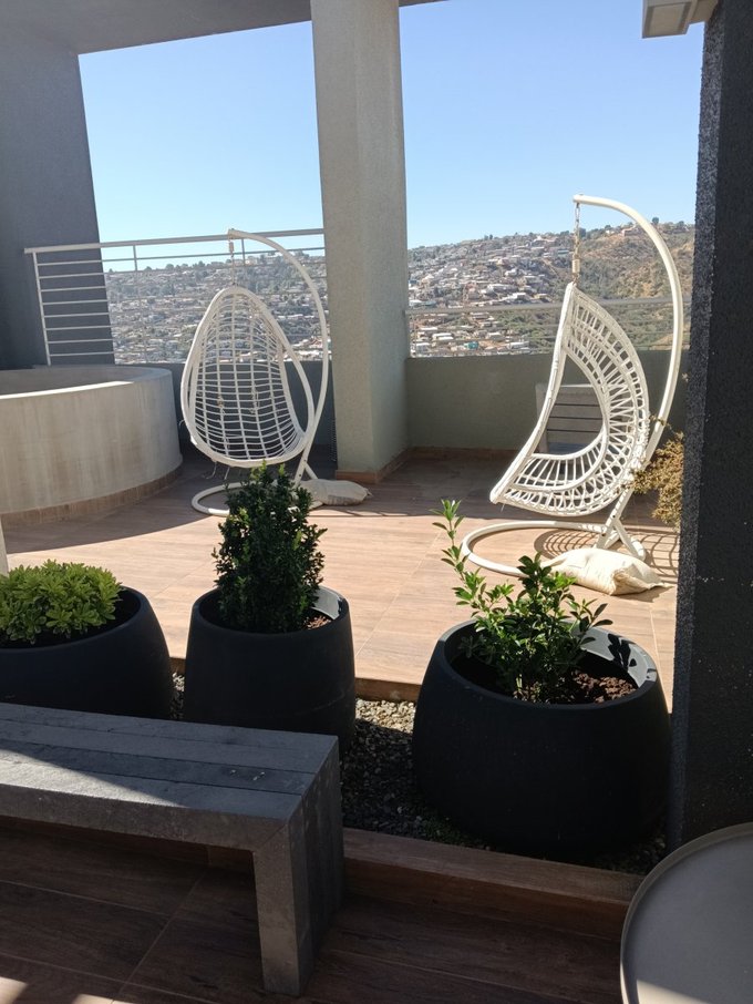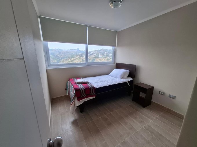 Departamento de 3 dormitorios (ppal en suite) más otro baño para los otros 2 dormitorios, Living-comedor con salida a terraza con linda vista al valle y al mar, cocina americana amplia , muy bien equipada, cuenta con espacio para instalar la lavadora, tiene 1 estacionamiento y 1 bodega, está en piso alto,