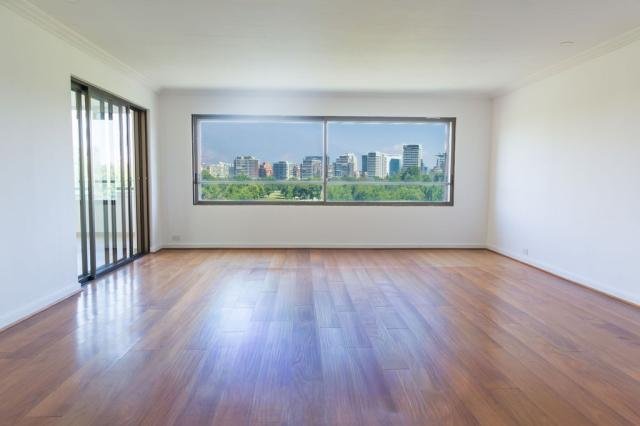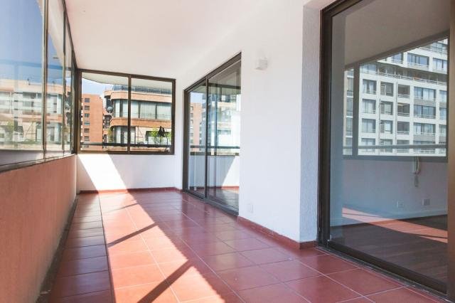 EXCELENTE DEPARTAMENTO RECIEN REMODELADO, ubicado en barrio prestigioso de Santiago, caminable a Parque Bicentenario y autopistas, servicios, bancos, restaurantes. EDIFICIO impecable estado, tradicional con acceso controlado y dos ascensores que llevan al piso, dos departamentos por piso, con orientación norte, oriente y sur, VISTA GOLF. Amplio hall de entrada y recibos grandes separados, ventanales con 3 vidrios para el ruido, gran terraza vidriada. Acceso con pisos de mármol, recibos y comedor con pisos de madera, amplia cocina con espacio para comedor de diario full equipada y amoblamiento nuevo, amplia loggia y recibos completos. Escritorio todo revestido en boiserie de madera natural de amplio tamaño, 3 dormitorios amplios, 2 baños, principal en suite amplia, walking closet y terraza con salida de dos de los dormitorios. 2 estacionamientos y 1 bodega. Código interno Procasa: 68806