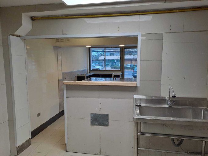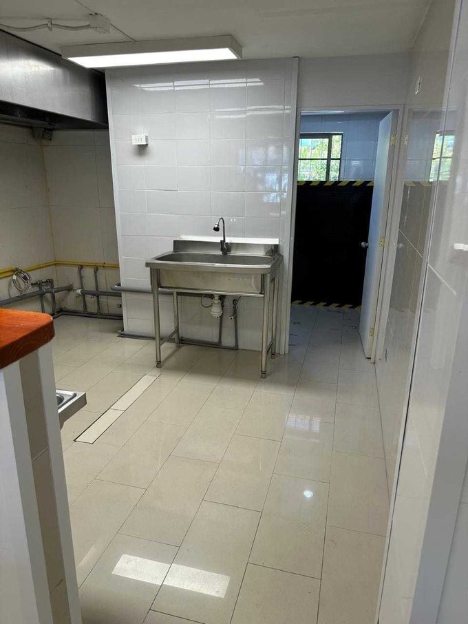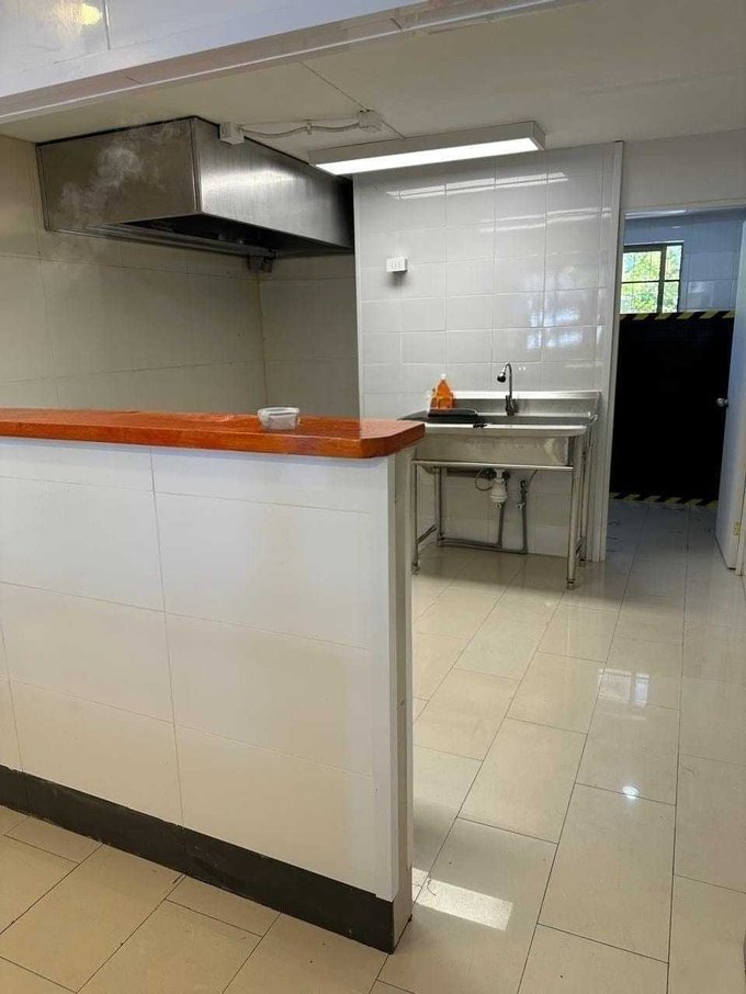 - Equipado con lavaplatos de acero inoxidable, campana con extracción de aire, dos lavamanos, aire acondicionado y mesón de atención.