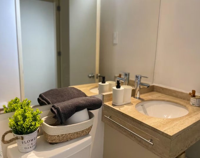 El departamento cuenta con Living-comedor, cocina americana equipada con refrigerador, encimera, horno eléctrico, electrodomésticos, moderna y funcional, 2 dormitorios, principal en suite con cama matrimonial + 2 baños completos, terraza.