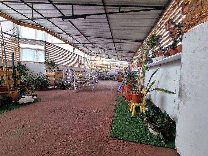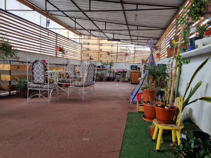 Hermosa y amplia terraza techada con harta vegetación