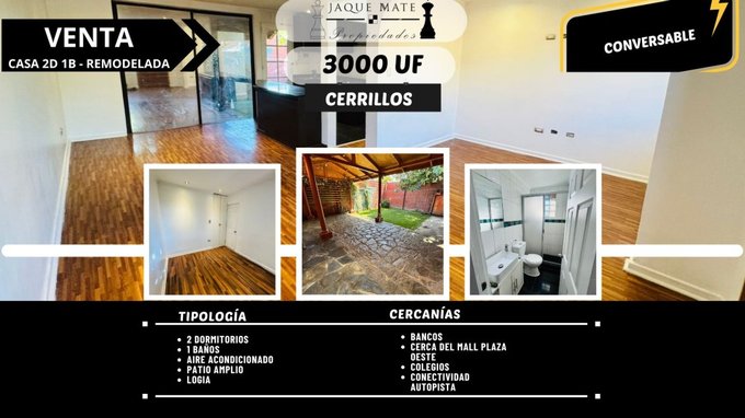 Descubre tu nuevo hogar en Cerrillos! Esta acogedora casa, valorada en 3300 U.F., ofrece un espacio ideal para disfrutar de la vida familiar. Con una construcción de 61 m y un terreno de 154 m, esta propiedad te brinda el equilibrio perfecto entre comodidad y amplitud. Su ubicación estratégica cerca del Mall Plaza Oeste te garantiza acceso a una amplia variedad de servicios, tiendas y entretenimiento a solo minutos de distancia.
