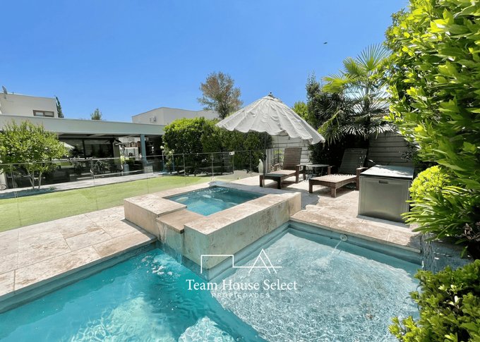 -Piscina de hormigon (8*3) con jacuzzi y cascada, borde en mármol travertino y vidrio templado perimetral.