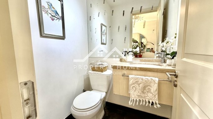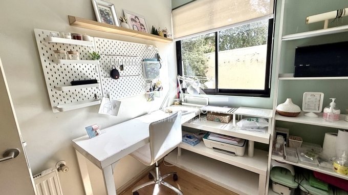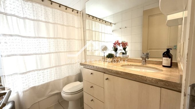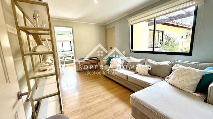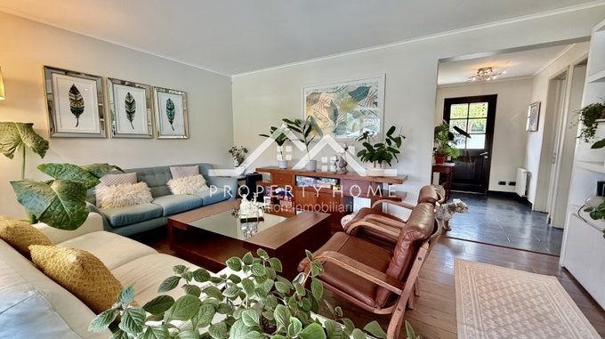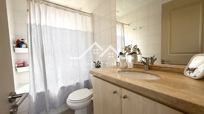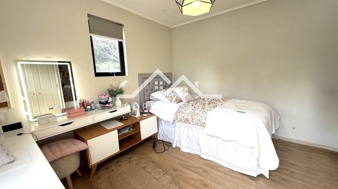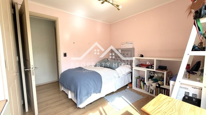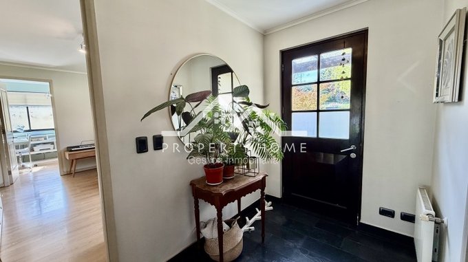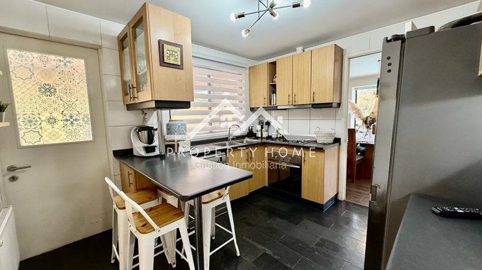 Piso piedra pizarra en hall de acceso, baño de visita, cocina y terrazas, Piso flotante en living comedor y dormitorios. Puertas y Closet pintadas de blanco. Amplio entretecho que sirve de bodega.