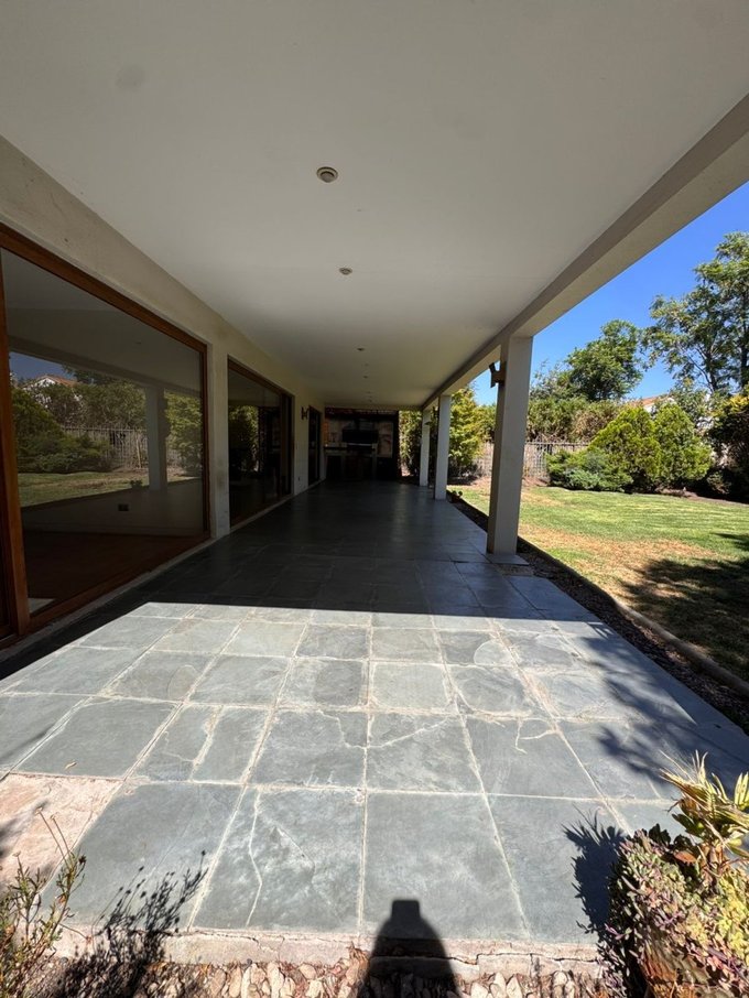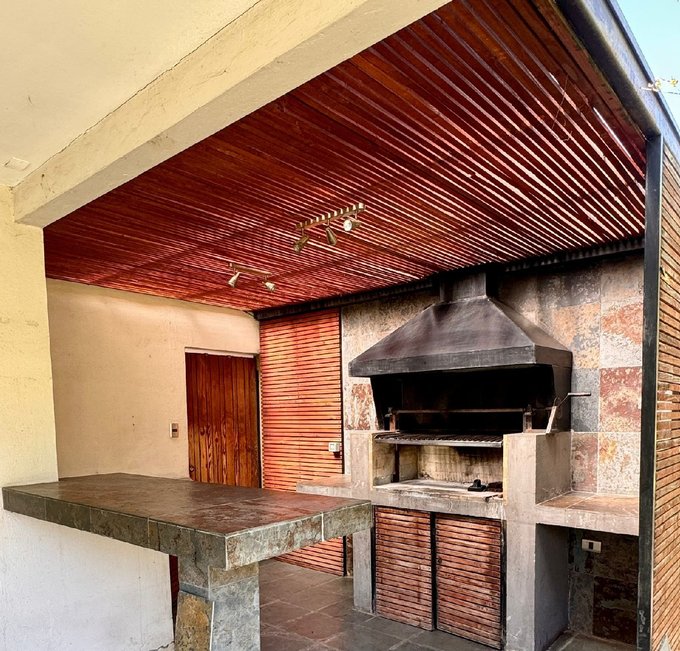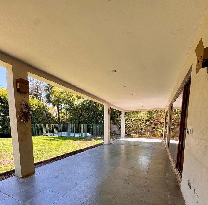 Exterior: terraza techada, quincho, piscina, estacionamiento para tres vehículos.