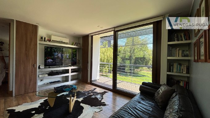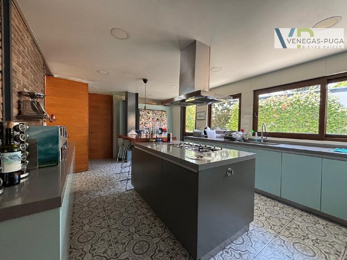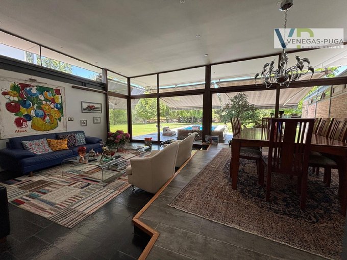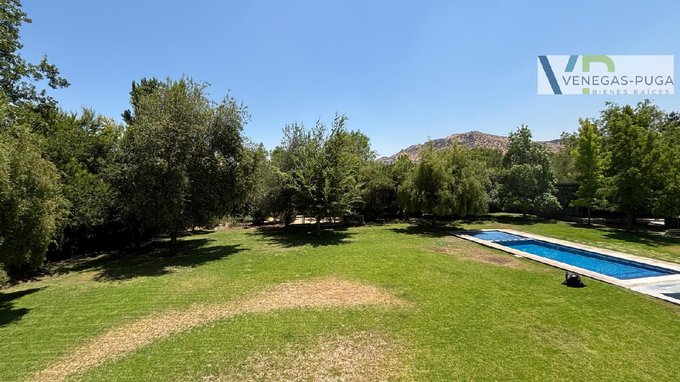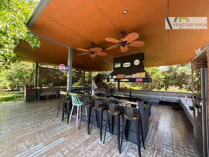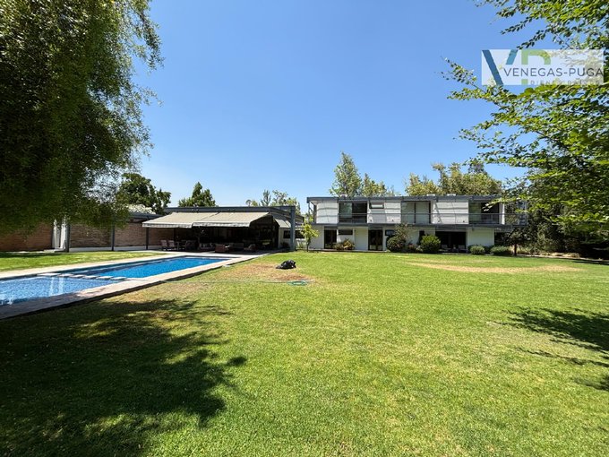 Amplia terraza techada de 80 m2, completo quincho, parrilla, hornos, lindo jardín formado con macizos arbustivos, grandes árboles, canil riego automático, piscina.