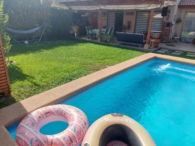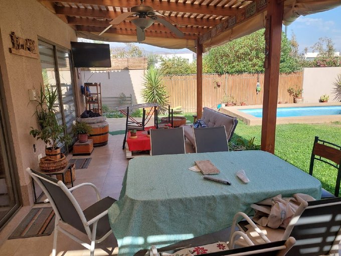 Detalles: piscina, terraza techada de buen tamaño, jardín formado con arbustos y árboles, quincho en terraza, parrilla, estacionamiento para tres vehículos, ventanas termopanel.