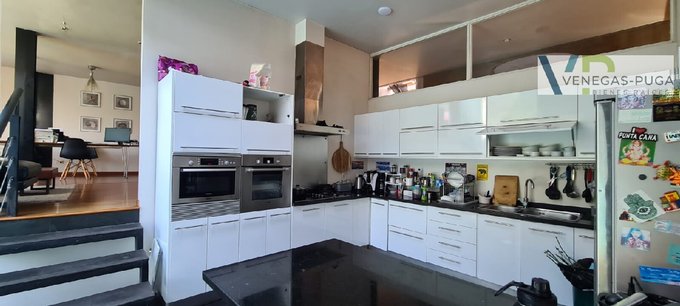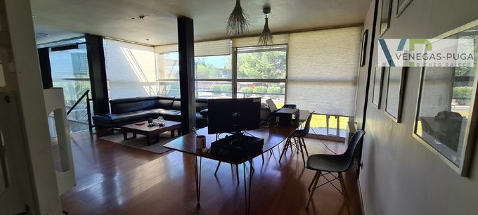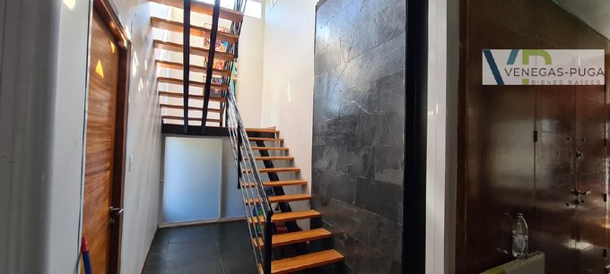 Hall de distribución, baño visita, living y comedor juntos, cocina amoblada, sala de estar o estudio con escalera caracol que conecta al segundo piso.