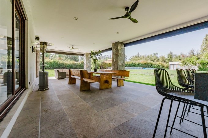 Living con estufa a etanol, ventanales de gran altura y luminosidad, comedor de gran tamaño, separados por muro y peldaño con salida a terraza techada y quincho.
