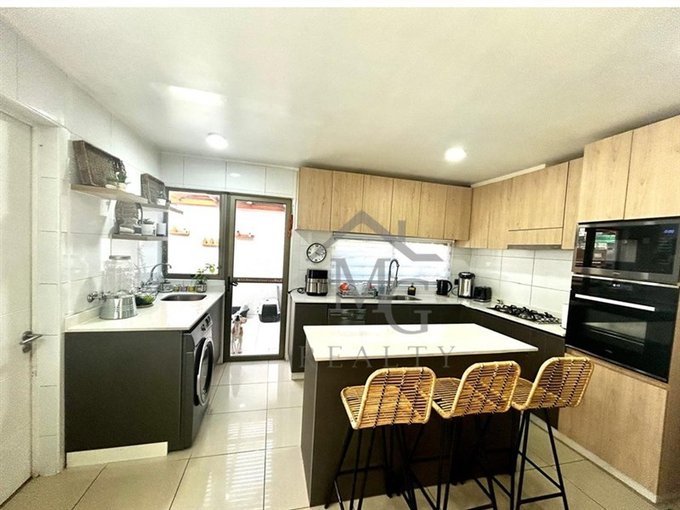 Moderna cocina recién remodelada con mesones de granito y equipada con encimera a gas, horno , campana e isla central o comedor de diario.