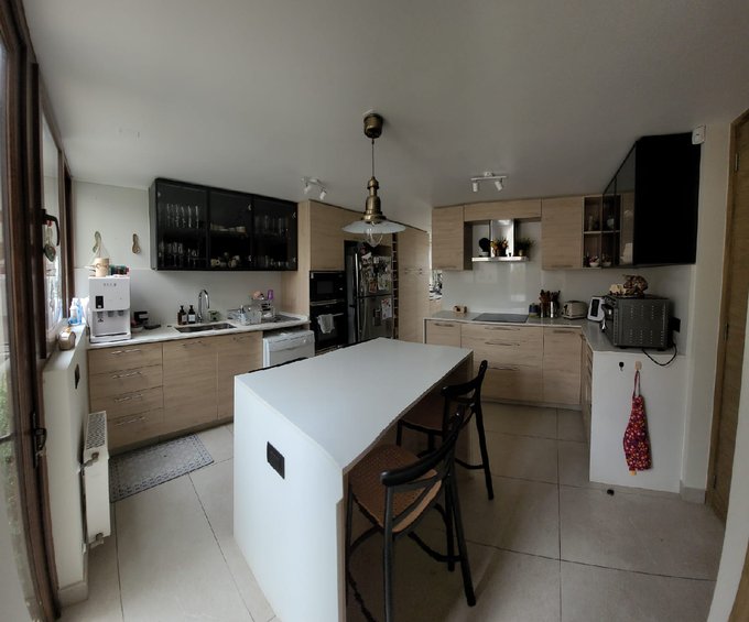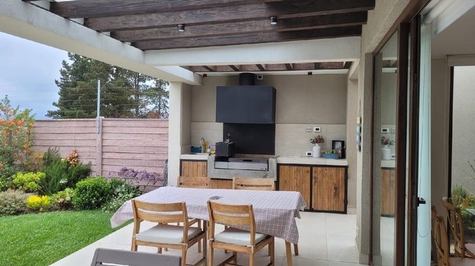 Además, portón eléctrico individual y cerco eléctrico. Cocina full eléctrica con isla (horno empotrado, encimera y campana) y salida directa a una amplia terraza con quincho empotrado, ideal para reuniones. Living-comedor luminoso, baño de visitas y excelente circulación interior. Escalera segundo piso con terminación en piso flotante.