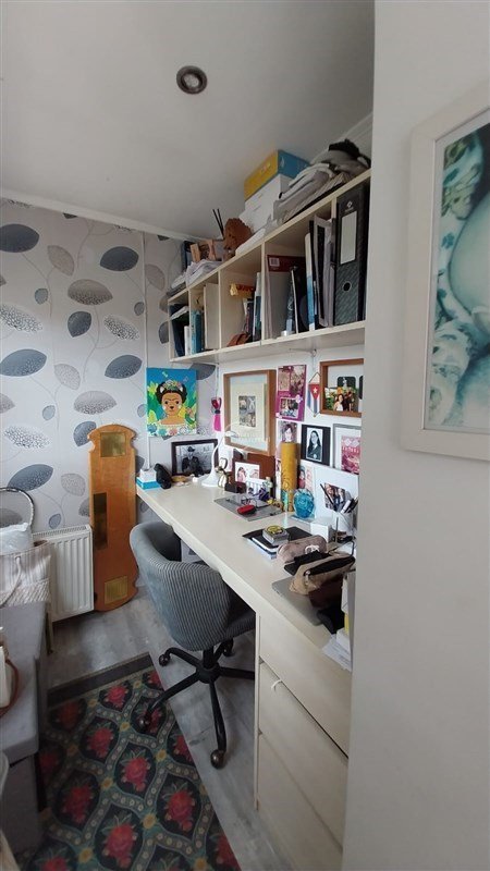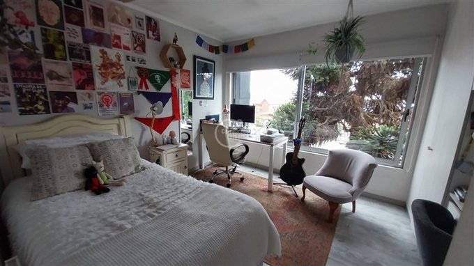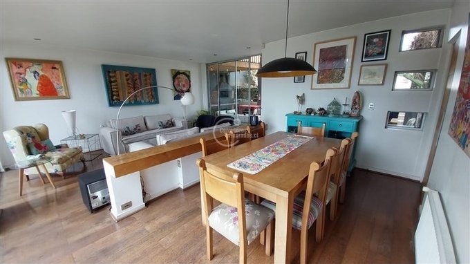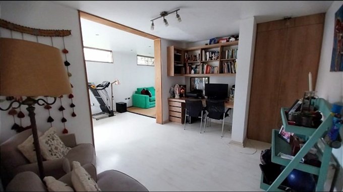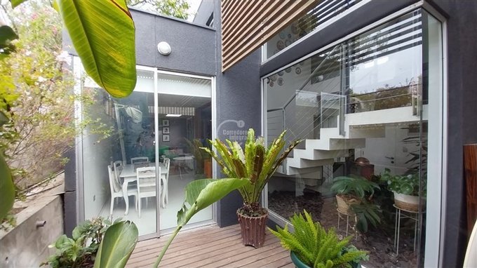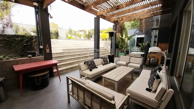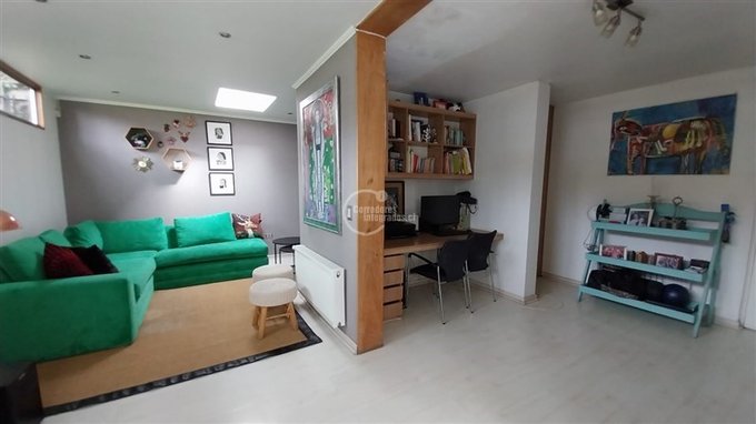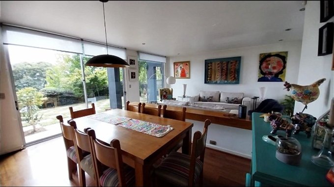 Amplia sala de estar con área de comedor y sector de escritorio de grandes dimensiones con salida a terraza y jardín posterior.