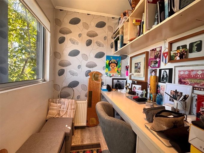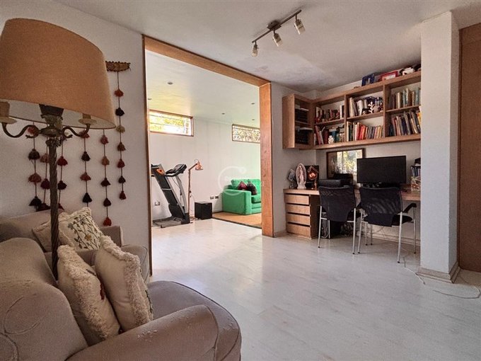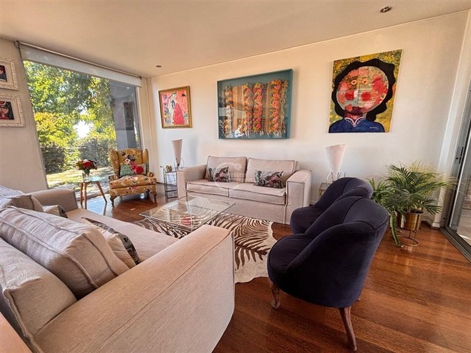 Amplia sala de estar con área de comedor y sector de escritorio de grandes dimensiones con salida a terraza y jardín posterior.