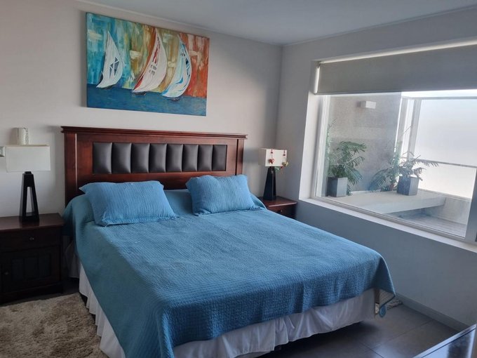 El departamento cuenta con 2 dormitorios amplios, el segundo dormitorio con cama plegable vertical, 2 baños (ambos en suite), cocina integrada equipada con encimera eléctrica, horno y campana eléctrica, espacio y conexión para lavadora, living y comedor, terraza con vista al mar y con malla de seguridad, 1 estacionamiento superficie y 1 bodega.