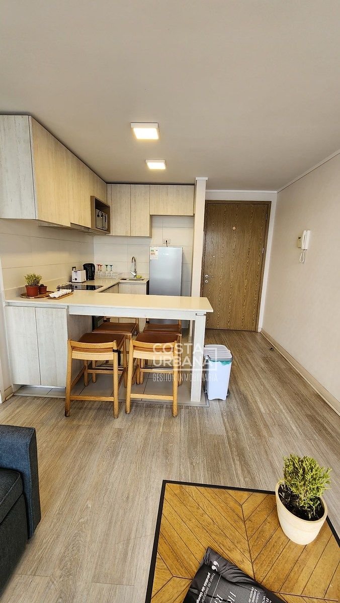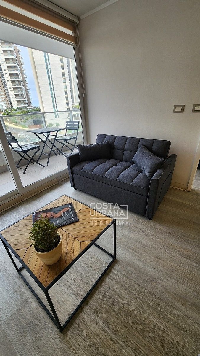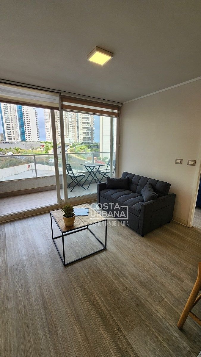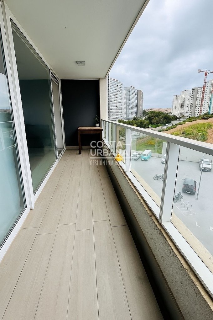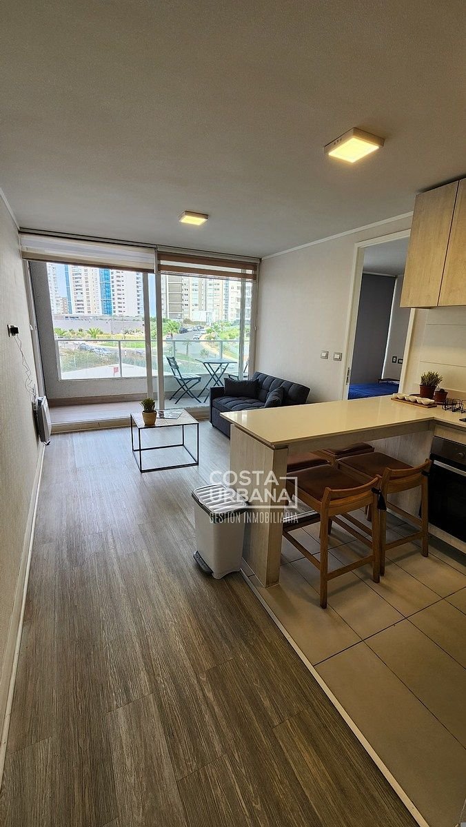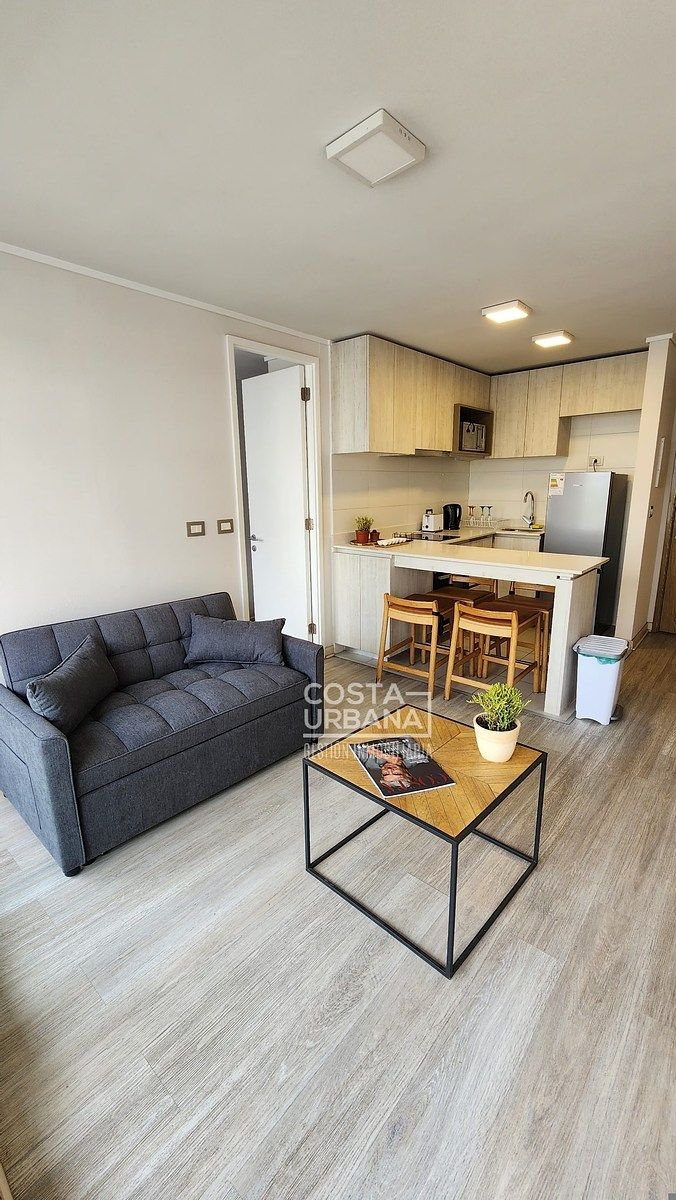 Es un departamento, seminuevo, de un dormitorio y un baño, con cocina abierta a la sala y clóset con conexión para lavadora, además, posee de una cómoda terraza con vista parcial a las dunas de Concón y un estacionamiento subterráneo.