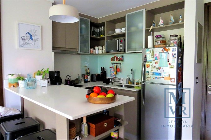 Departamento tipo mariposa, ofrece 2 dormitorios y 2 baños, pensados para una vida práctica y confortable. Cocina Americana con cubierta de silestone, cocina encimera de vitrocerámica, horno electrico y campana.