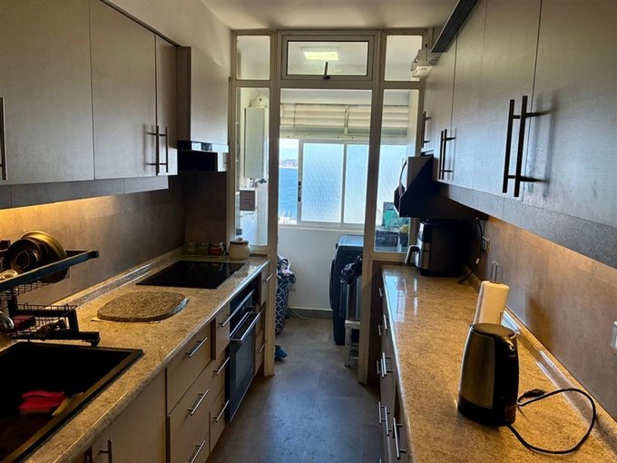 Cocina remodelada con cubierta de granito, horno y encimera eléctrica y varios muebles de almacenamiento, que conectan con logia cerrada