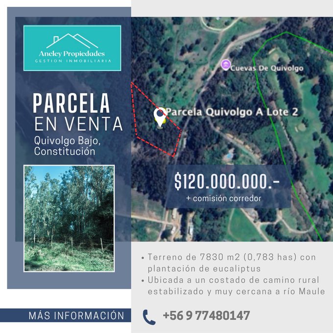 Se vende parcela de 7.830 m2 (0,783 has), a pocos minutos de Constitución, ubicada en sector Quivolgo a un costado de camino rural, cercana a río Maule y a ruta J52 que une Constitución y Putú. Cuenta con rol individual (lista para escrituración), cerco perimetral y plantación de eucaliptus. Factibilidad de agua y energía eléctrica.