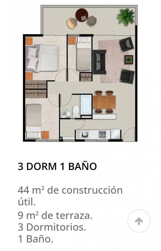 El departamento se compone de 3 dormitorios, un baño, cocina americana integrada, lo que permite una permanente comunicación e interacción de los residentes, amplio living con salida a la terraza cerrada, con suficiente espacio para una mesa y 4 sillas, para poder disfrutar de un desayuno al aire libre o contemplar un atardecer con tranquilidad y hermosos paisajes.