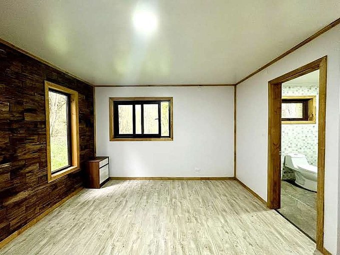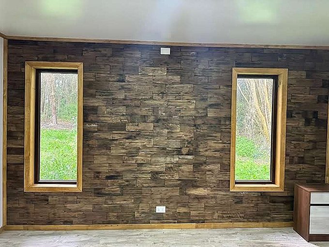 Desde la entrada hacia la izquierda se ubica el dormitorio principal en suite con Walking closet y aplicaciones de tejuela de alerce reciclado en muros y otro dormitorio adicional posible de ocupar como oficina.