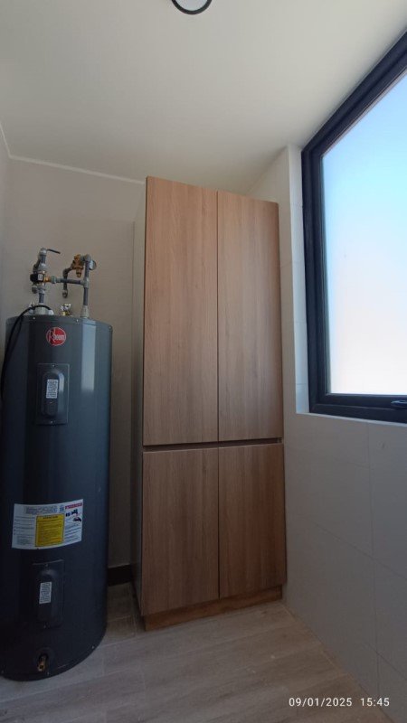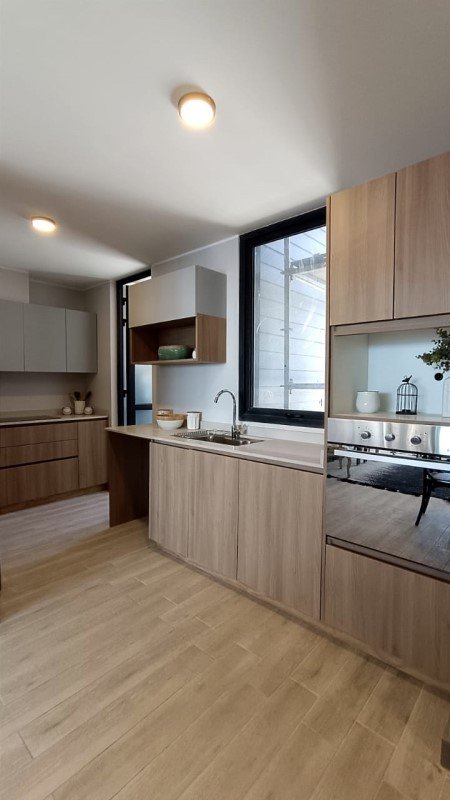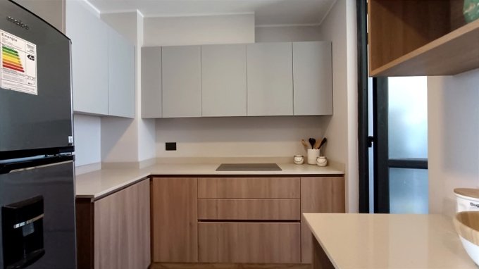 La cocina esta completamente equipada, con excelente espacios de almacenamiento, Cubierta de cuarzo, Horno, encimera y campana, FDV o similar, muebles en piso y muro. Desde la cocina se accede a la logia, que tiene el termo eléctrico y el lavadero.