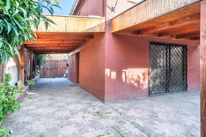 El exterior ofrece estacionamiento techado con cobertizo de madera para tres a cuatro vehículos, terraza techada con iluminación empotrada, bodega y antejardín. La propiedad se encuentra cerca de colegios como Santa María de Lo Cañas, Colegio Alicante de la Florida y Escuela Elsa Santibañez.