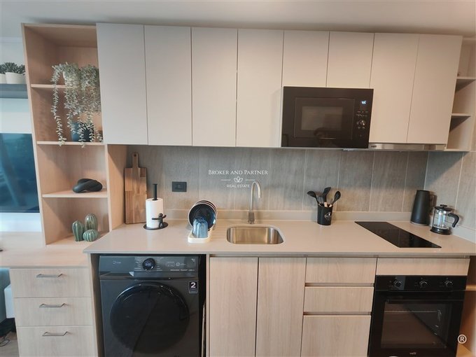Cocina integrada equipada con refrigerador, encimera, horno, microondas, campana eléctrica, lavadora . Cubiertas de cuarzo y espacio para refrigerador.
