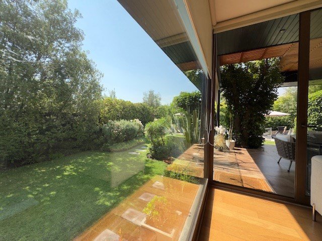 Rico jardín formado con riego automático y piscina