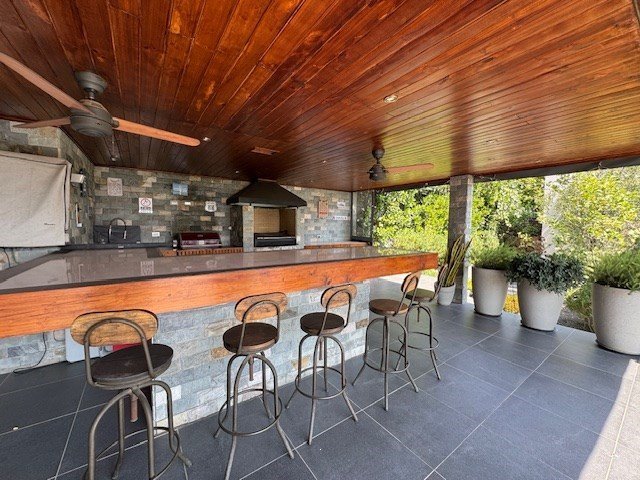 A un costado, debes subir unas escaleras y se encuentra un quincho con terraza de 60 m2, barandas de vidrio templado que realza la arquitectura contemporánea con una increíble vista despejada. Equipado con lavamanos, parrilla a gas y carbón, lavavajilla, microondas, frigobar, televisor, ventilador y mesón para más de 12 personas y cuenta con baño.
