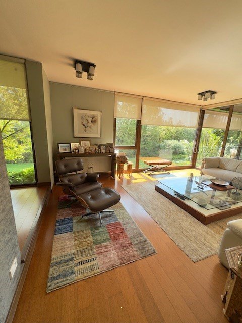 Hall de entrada. Puerta de acceso al amplio living y comedor separados. Destacan lámparas con iluminación LED y baño de visita. Espacios interiores muy bien distribuidos y en desnivel, con acceso a una terraza de 20 m2 y al jardín.