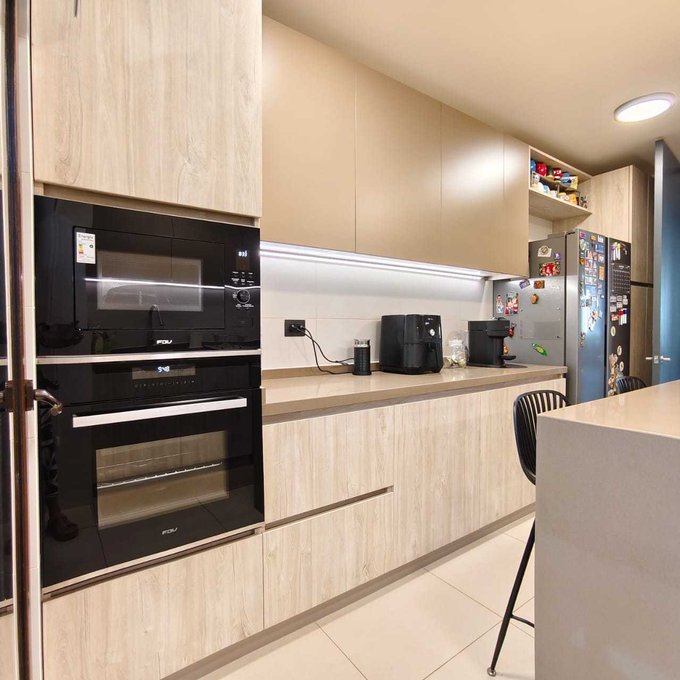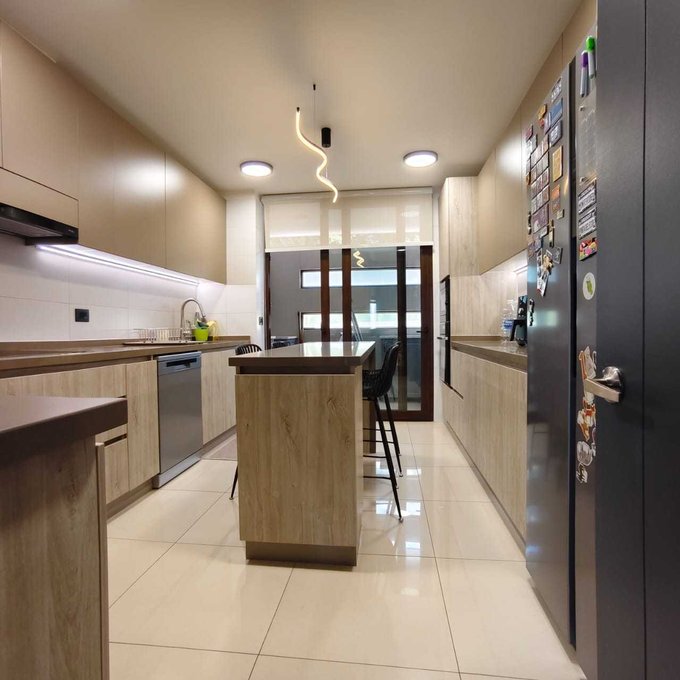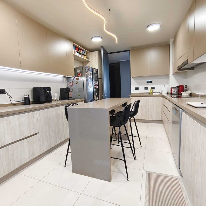 Gran cocina equipada con encimera, horno eléctrico empotrado, campana, mobiliario con buen almacenaje impecable, cubierta de cuarzo, mesón en isla.