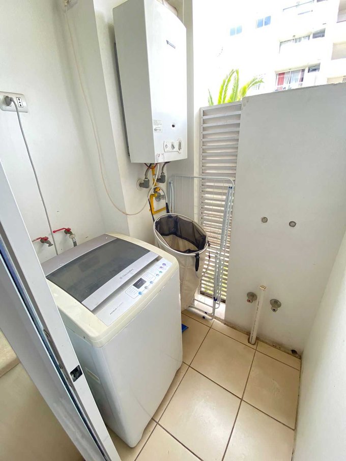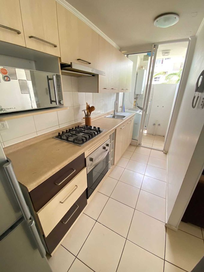 La propiedad cuenta con 2 dormitorios alfombrados, 1 baño, y una funcional cocina semi americana, equipada con horno eléctrico, encimera, campana y amplios muebles de almacenamiento. El departamento destaca por su excelente iluminación natural y dispone de 2 balcones/terrazas, ideales para disfrutar del aire libre. Además, cuenta con una logia independiente con conexión para lavadora, lo que aporta mayor comodidad.