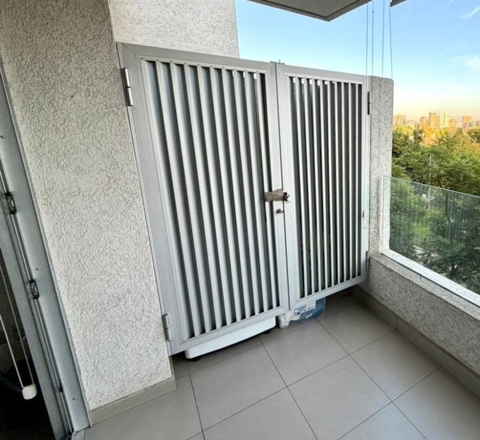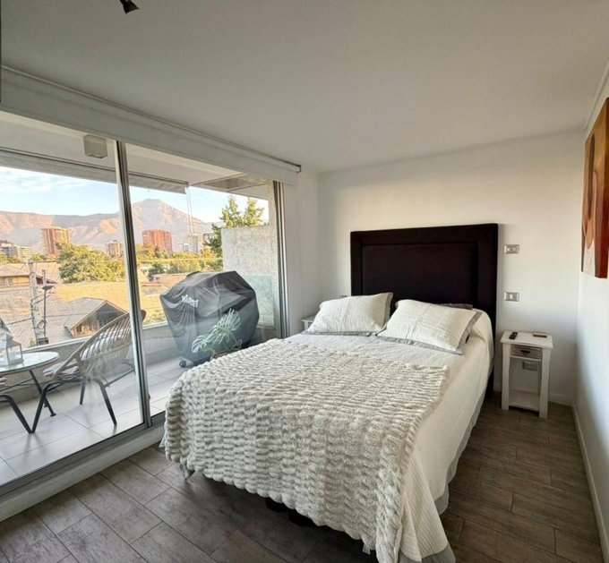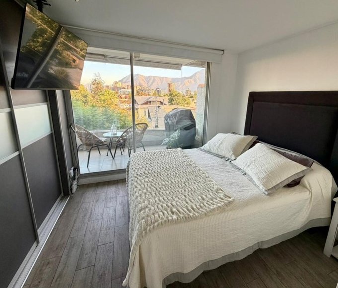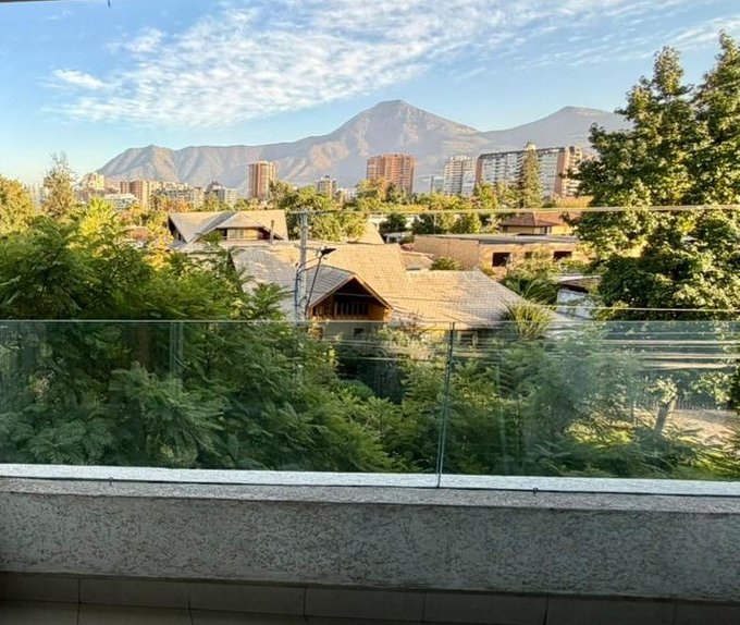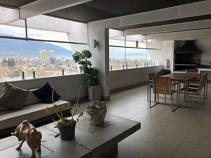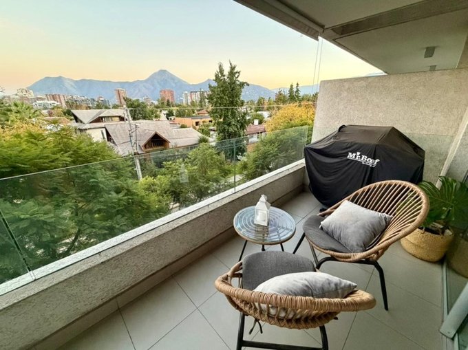 Amplia terraza con orientación norte, gran vista a cerro Manquehue y con roller doble (semi traslúcido y black out)