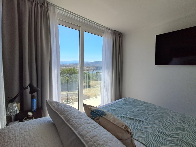 Detalles de Lujo: Ventanales en Termopanel PVC, puertas y escaleras de madera noble, y terrazas con barandas de vidrio templado para no interrumpir el paisaje.