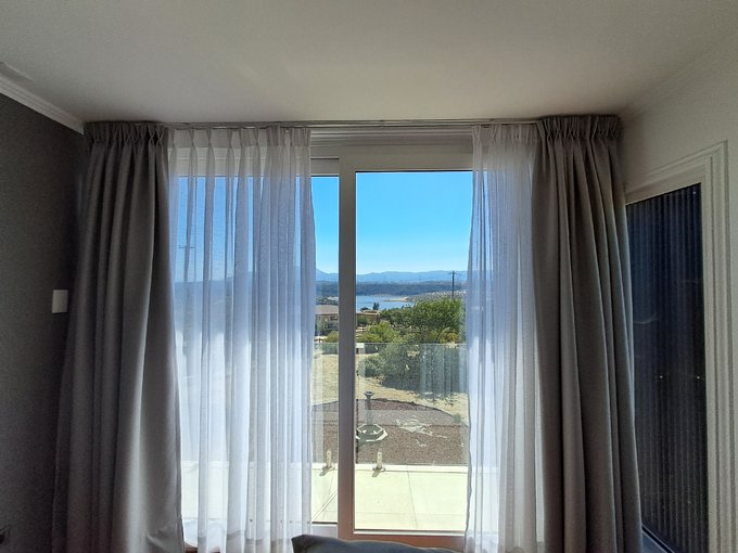 Ventanales panorámicos hacia la piscina y el lago.