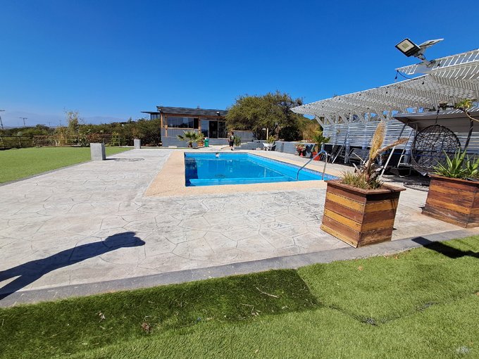 Sector Piscina: Piscina de concreto de 10 x 5 mts (profundidad hasta 1,80m) rodeada de pavimento texturizado y una elegante pérgola blanca iluminada.