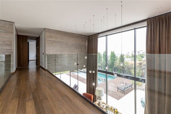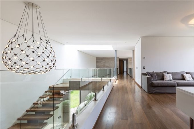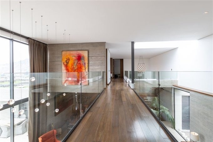 Segundo piso con 4 Suites, sala de estar, escritorio y sala de estudios que se distribuye con amplio pasillo central con barandas de vidrio templado lo que genera amplitud, luminosidad y vista a espacios comunes.