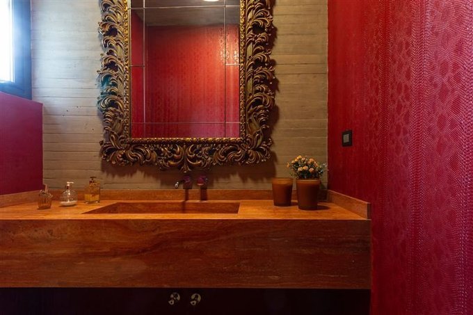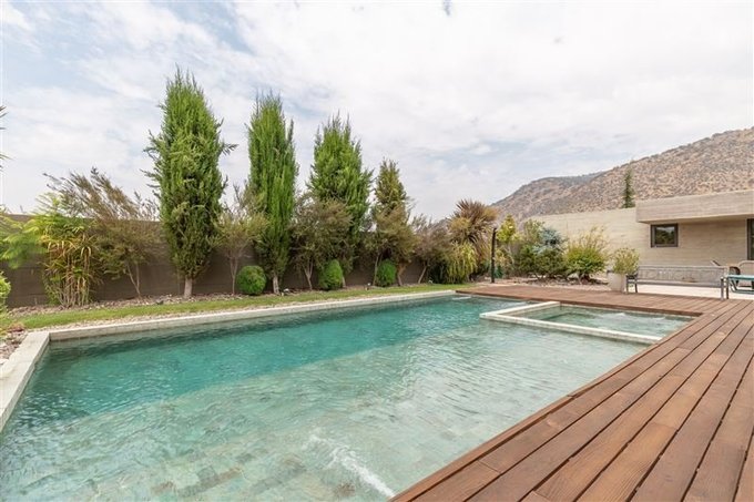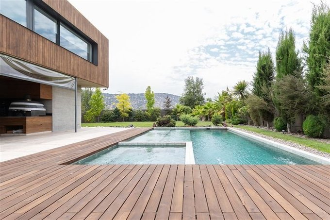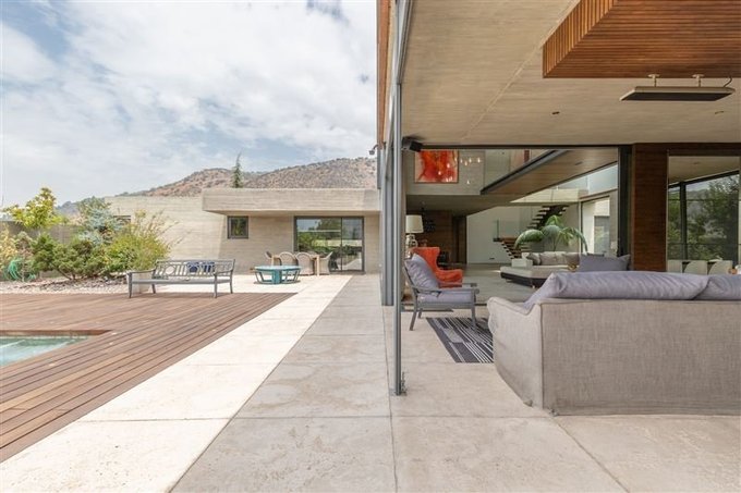 Cerámica para la terraza y piscina fueron importadas desde Brasil junto con la piedra de acceso al estacionamiento.