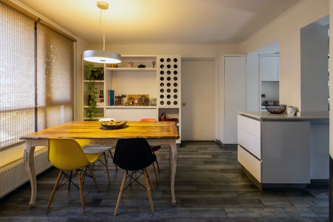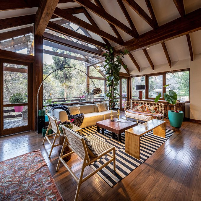 - Increíble living comedor de doble altura con vigas de madera a la vista y acceso a terraza con vista al río