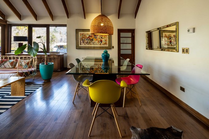 Preciosa y amplia casa en calle cerrada, con buena iluminación y vigas a la vista con doble altura en living comedor! Rodeada de naturaleza a orillas del rio!