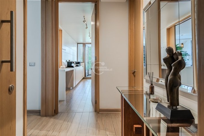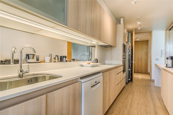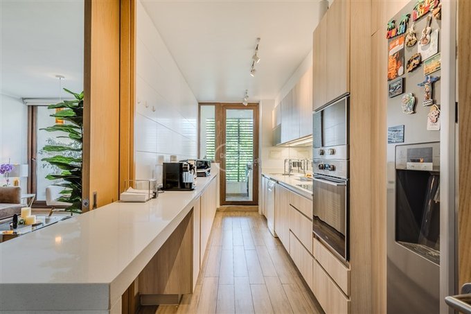 En 180 m2 totales, cuenta con hall de entrada, living y comedor juntos con acceso a una de las 2 terrazas, orientación Oriente. Cocina semi integrada con cubiertas de cuarzo, equipada con encimera, horno, lavavajillas y campana, además de comedor de diario y logia con ventilación natural.
