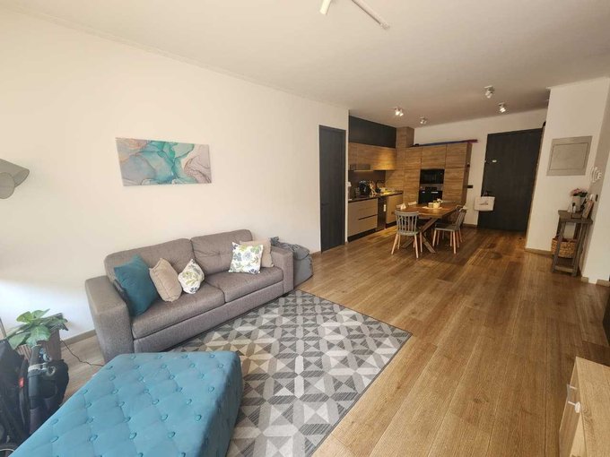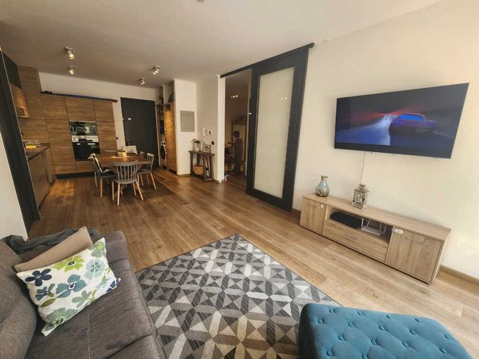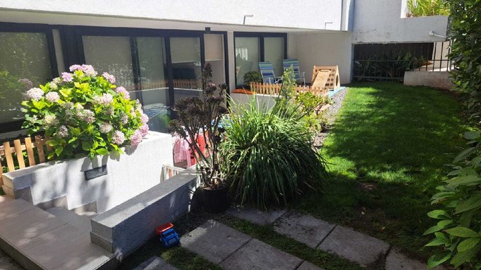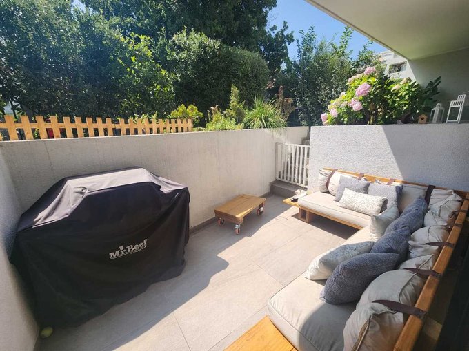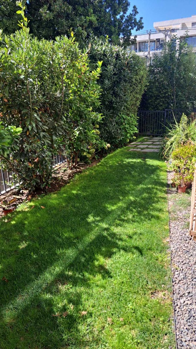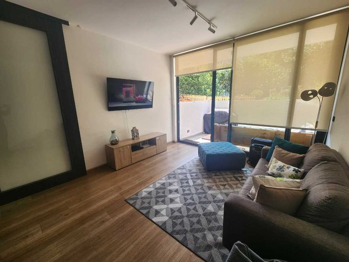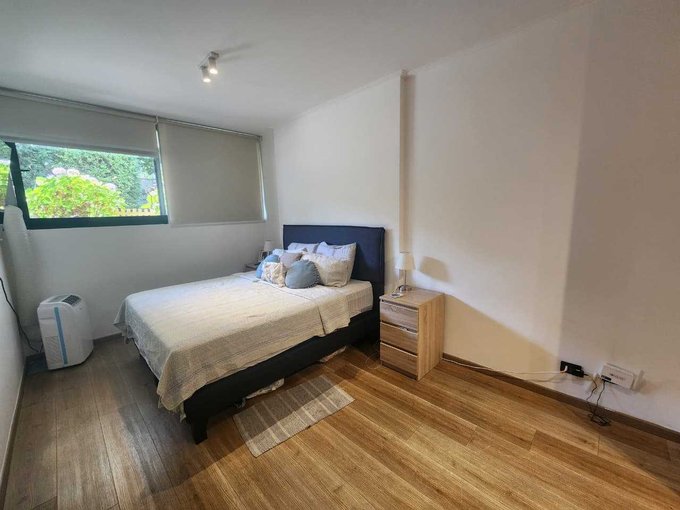 El departamento cuenta con acceso directo a un luminoso espacio de living-comedor, el cual se conecta a una terraza en primer nivel y, a través de unos peldaños, a un agradable jardín privado.