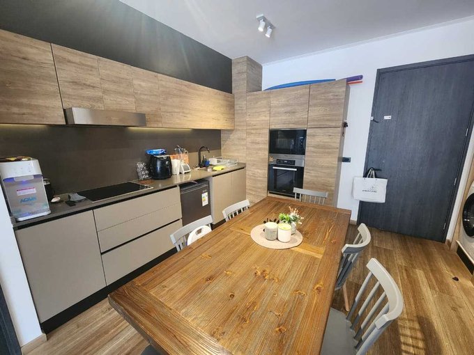 La cocina es integrada y se entrega equipada con refrigerador, horno y microondas empotrados, además de encimera eléctrica y campana.