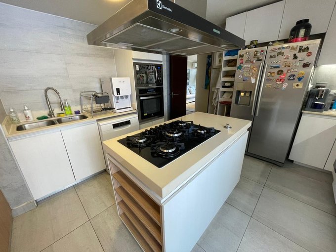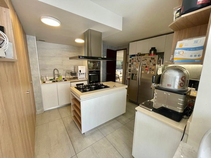 Cuenta con tres dormitorios más servicio, tres baños más baño de servicio, cocina cerrada full equipada con isla central, cubierta de cuarzo, horno empotrado y campana de acero. Posee loggia independiente, amplios living y comedor.