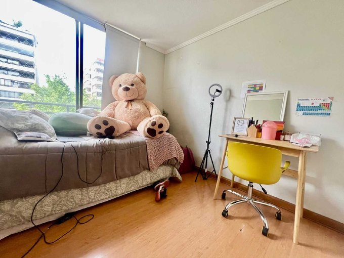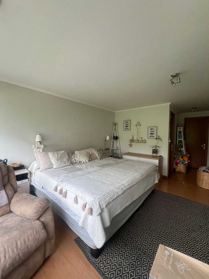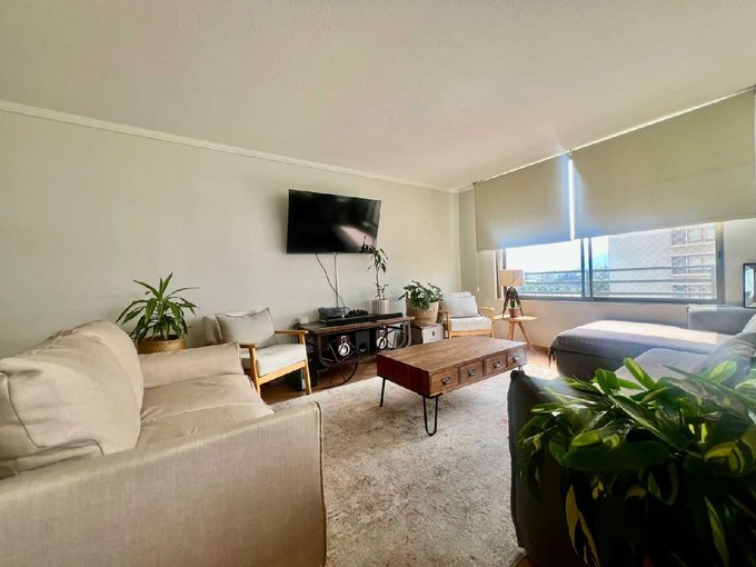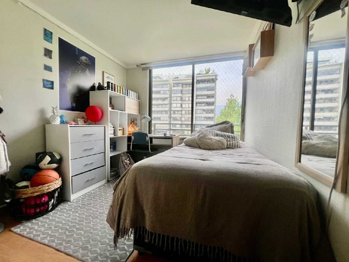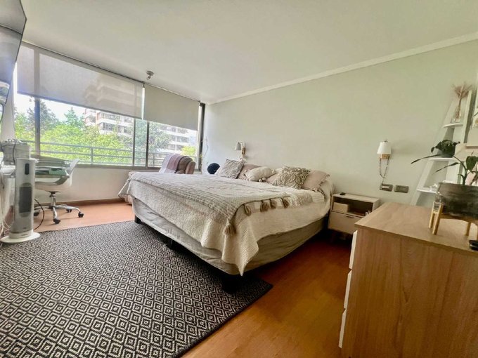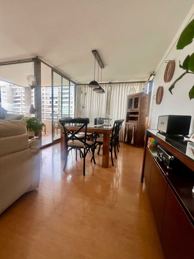 El departamento tiene 4 dormitorios y 3 baños incluídos la pieza y baño de servicio. Cocina tradicional de buen tamaño, amoblada y equipada, con logia, amplio living-comedor con salida a terraza con vista despejada al oriente. 2 estacionamientos y amplia bodega.