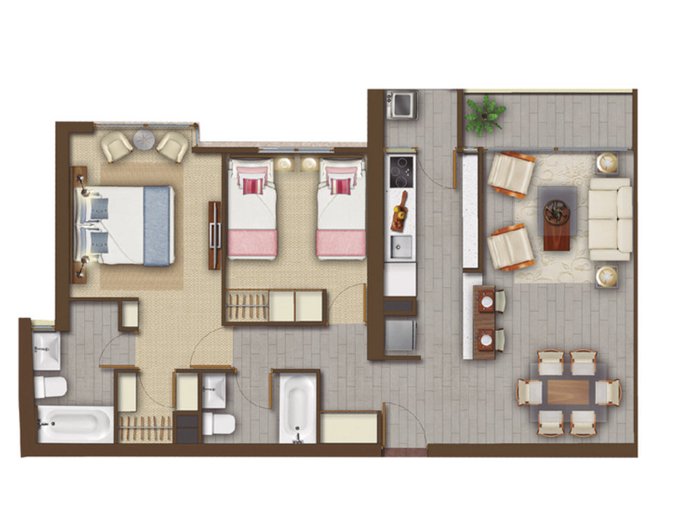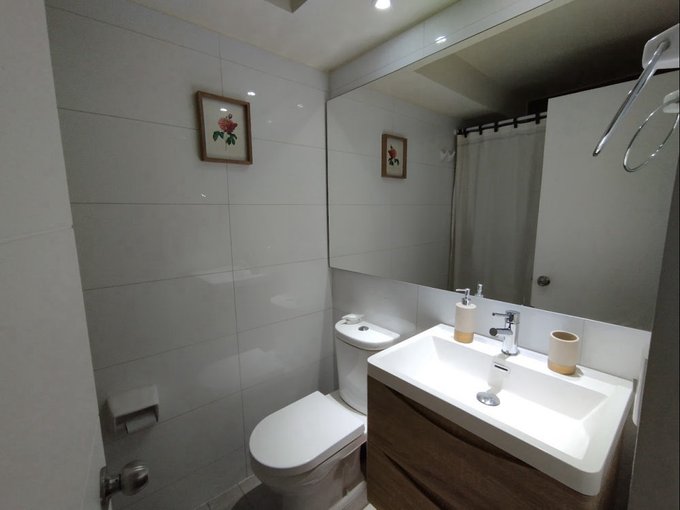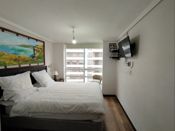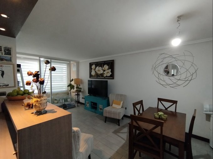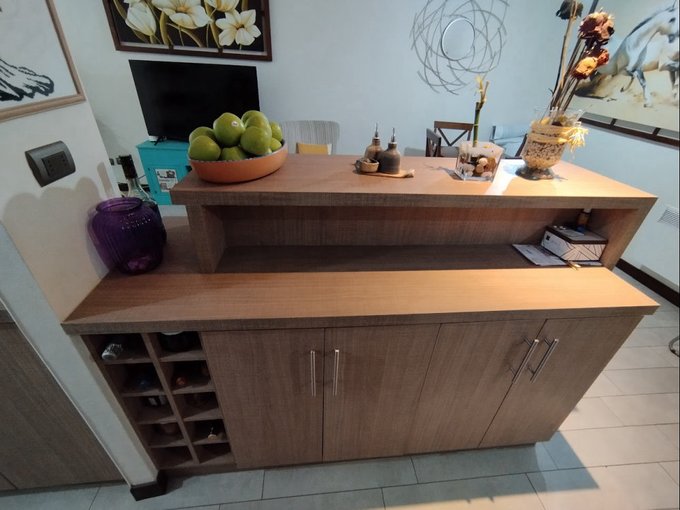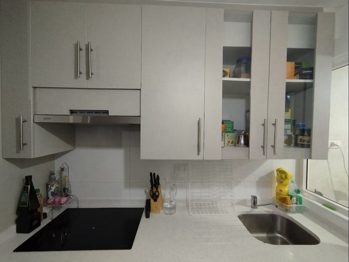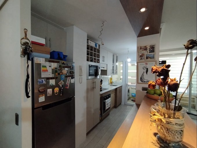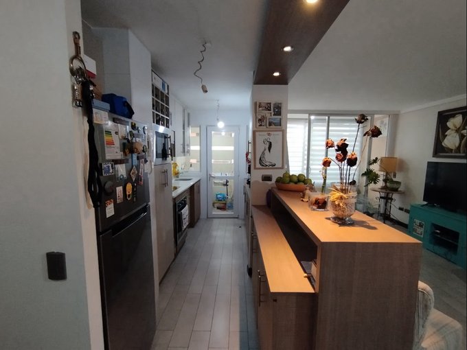 * Cocina semi americana equipada con mesón, horno empotrado, encimera vitrocerámica y microondas.