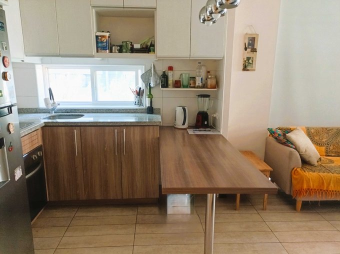 - Cocina con mesón de granito, encimera, horno empotrado y campana, todo eléctrico.