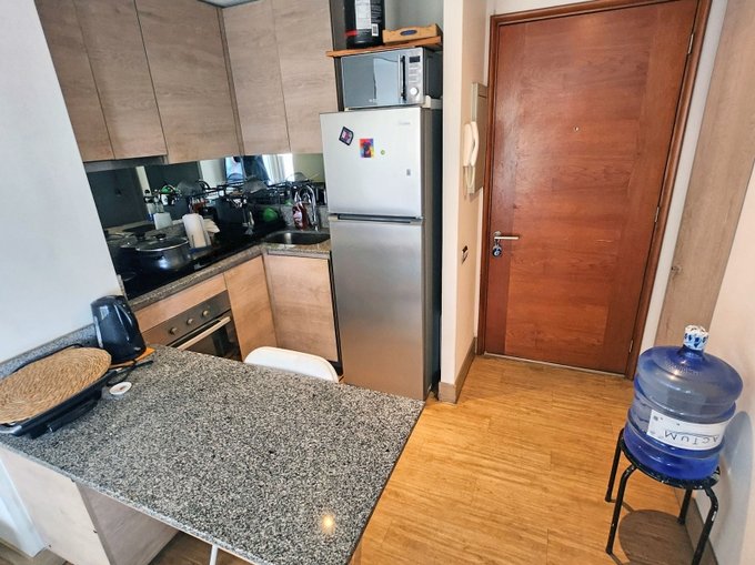 - Living y cocina americana juntos, con mesón de granito, artefactos empotrados eléctricos y espacio para refrigerador. Instalación para lavadora frente a cocina